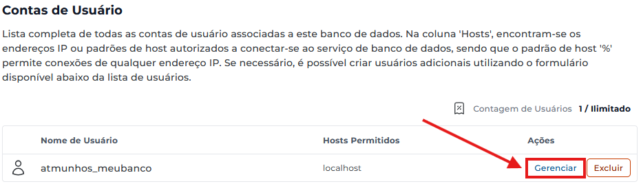 4 - Na tela seguinte, escolha o usuário vinculado ao banco de dados desejado e clique no botão Gerenciar;