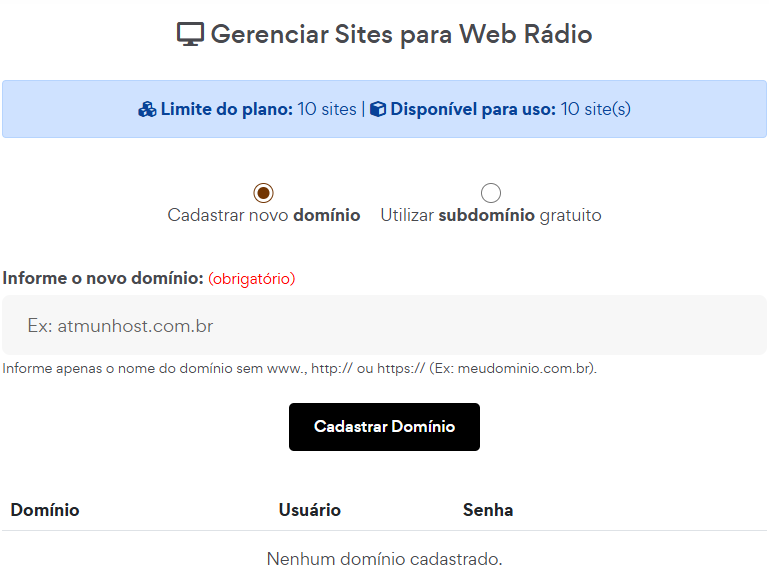 Em nosso exemplo, faremos a ativação do Site para Web Rádio para o domínio meudominio.com.br, com a opção "Cadastrar novo domínio" selecionada.