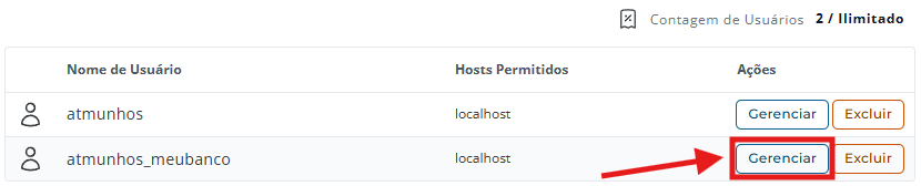 3 - Na tela que lista todos os bancos de dados ativos em sua conta, clique no botão Gerenciar Usuários;