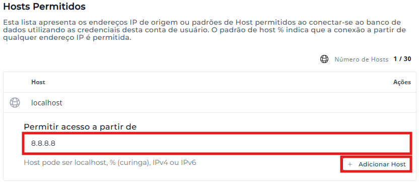 5 - Na seção Hosts Permitidos, insira o endereço IP que terá permissão para se conectar remotamente.