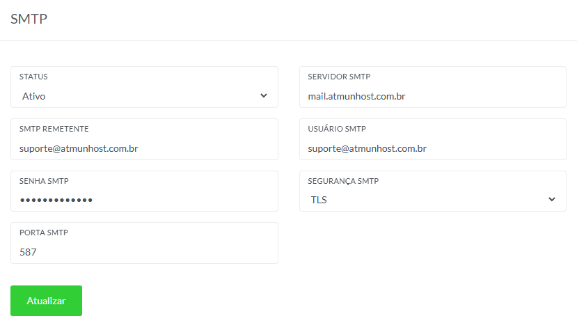 Status: altere para "ativo" para habilitar o envio de e-mails por SMTP.