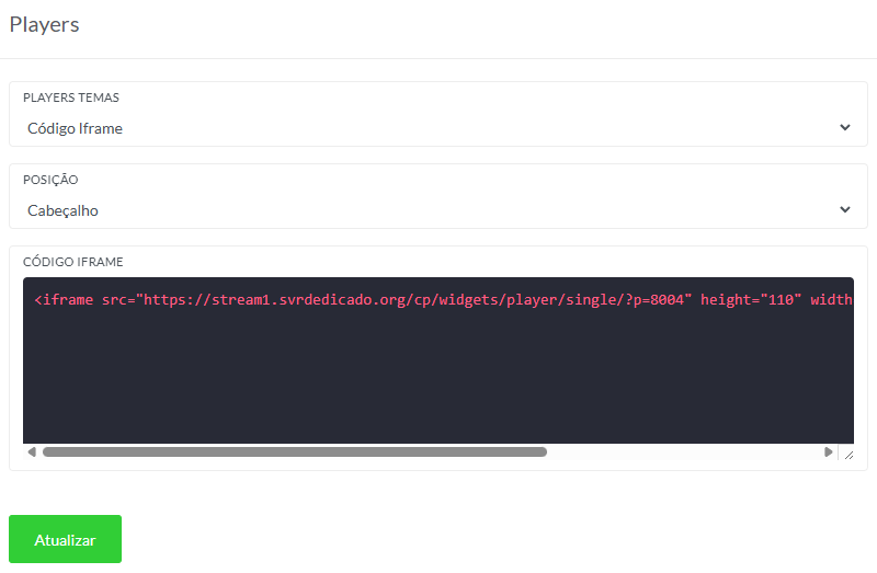 6 - Para usar seu próprio player, selecione a opção Código Iframe e cole o código fornecido pelo serviço de streaming ou pelo player externo que deseja utilizar (por exemplo, códigos HTML de players como Shoutcast, Icecast ou outros);