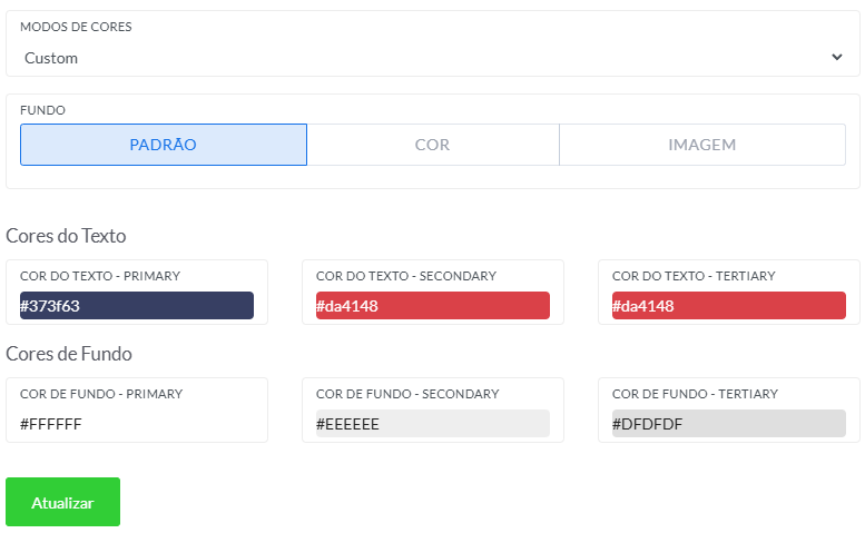 - Custom: permite definir manualmente todas as cores do site, escolhendo pelo seletor de cor ou inserindo o código hexadecimal (ex.: #313a5e) para definir cor principal, cor de fundo, cor do texto e demais elementos.
