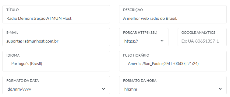 Descrição: adicione um texto curto descrevendo sua web rádio (essa descrição aparece em mecanismos de busca e nas redes sociais).