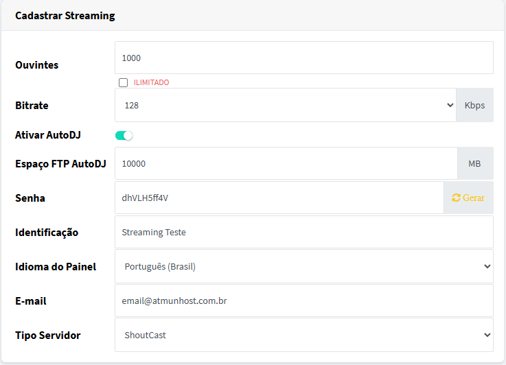 Tipo de Servidor: escolha entre ShoutCast ou IceCast (poderá ser alterado pelo próprio cliente em seu painel administrativo).