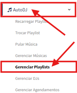 2 - No menu lateral, localize e clique em AutoDJ e, em seguida, clique em Gerenciar Playlists;