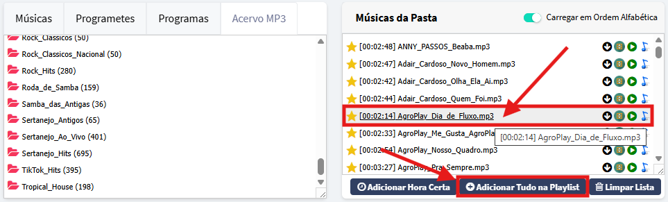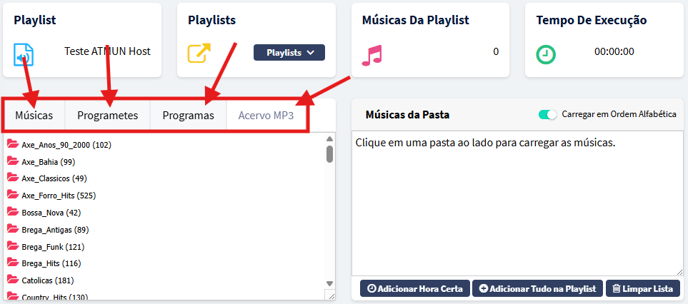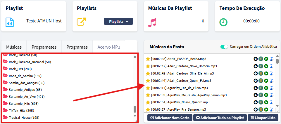 - Acervo MP3: lista de músicas separadas por estilo musical para utilizar na transmissão.