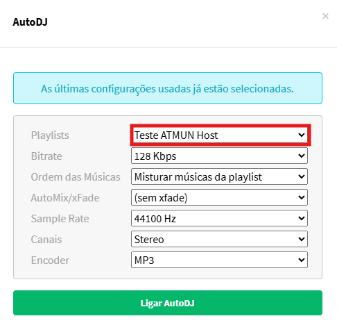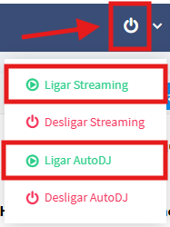 12 - Clique em Ligar AutoDJ para iniciar a transmissão por playlist;
