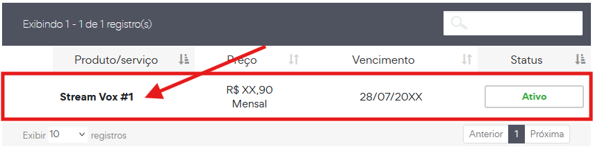 (No exemplo, o produto aparece como "Stream Vox #1", mas o nome pode variar conforme o plano contratado.)