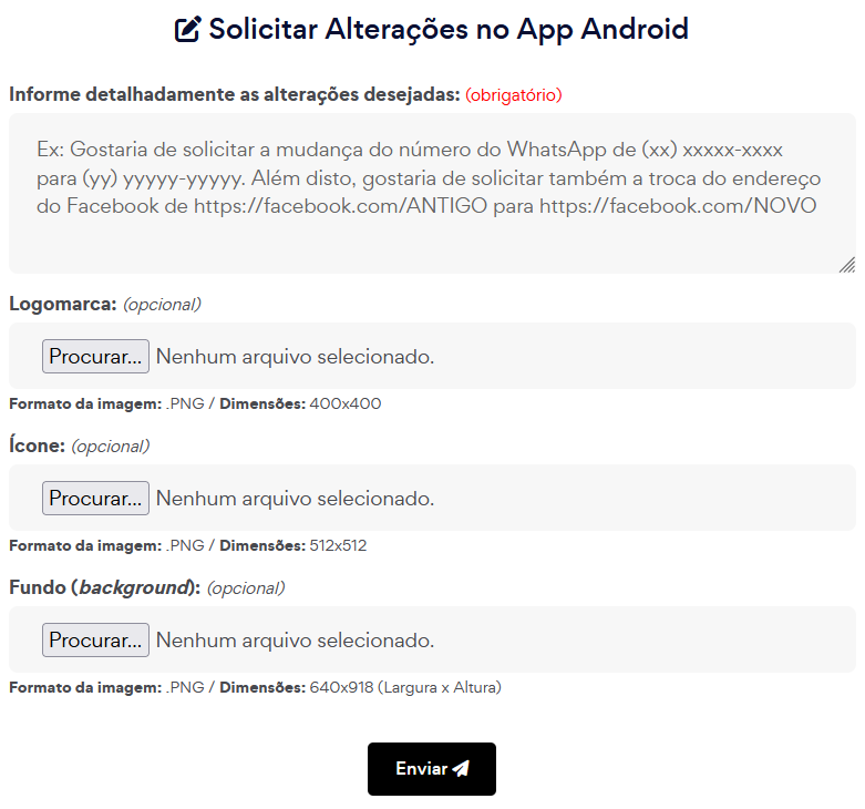 Se quiser atualizar imagens (logomarca, ícone e background), envie os novos arquivos.