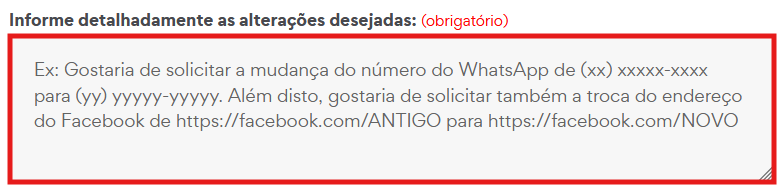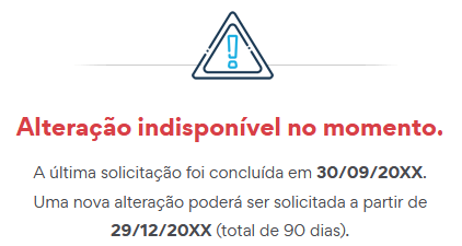 • Se aparecer a mensagem Alteração indisponível no momento (acima), significa que você já solicitou uma alteração recentemente e não poderá enviar um novo pedido pelos próximos 90 dias.