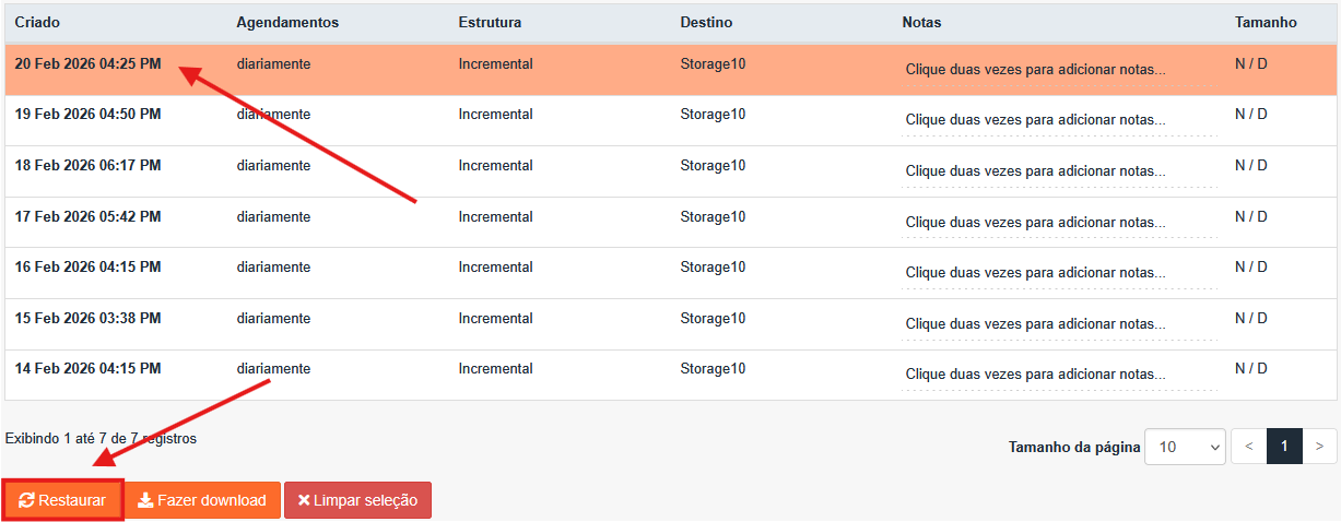 4 - Você verá uma lista com as datas disponíveis. Escolha o backup desejado e clique no botão Restaurar;