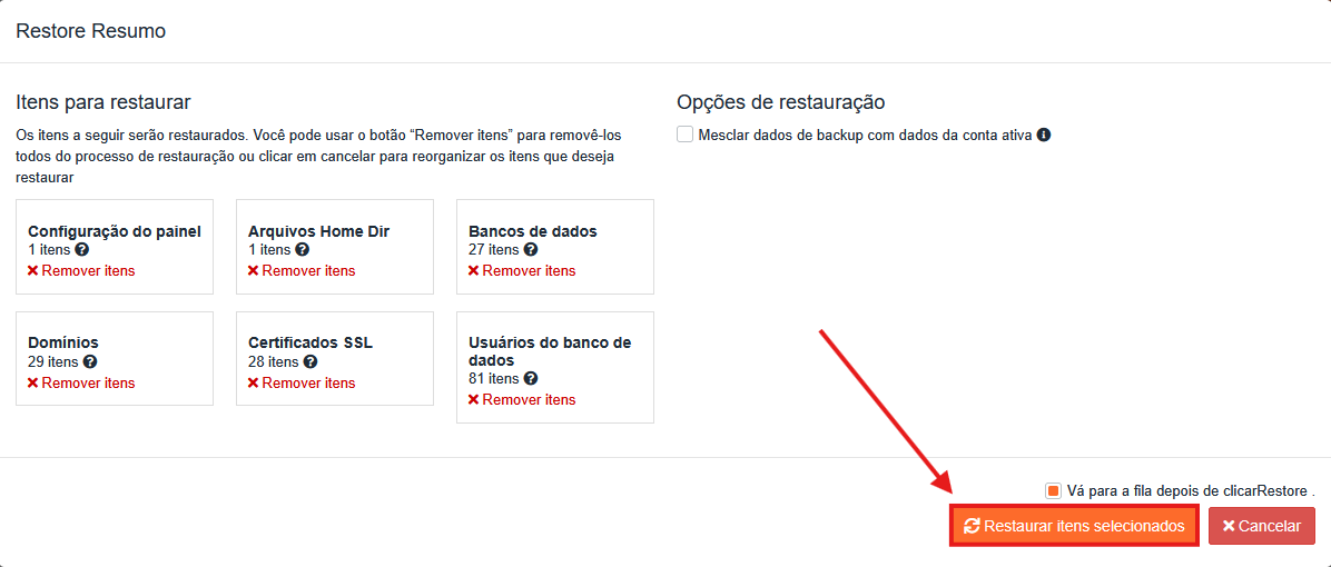 5 - Uma tela de confirmação (Restore Resumo) será exibida listando todos os itens que serão restaurados. Clique no botão Restaurar itens selecionados para iniciar o processo;
