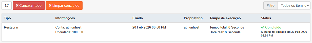 Você pode acompanhar o progresso na opção Fila. Quando o status mudar para "Concluído", sua conta terá sido restaurada com sucesso.
