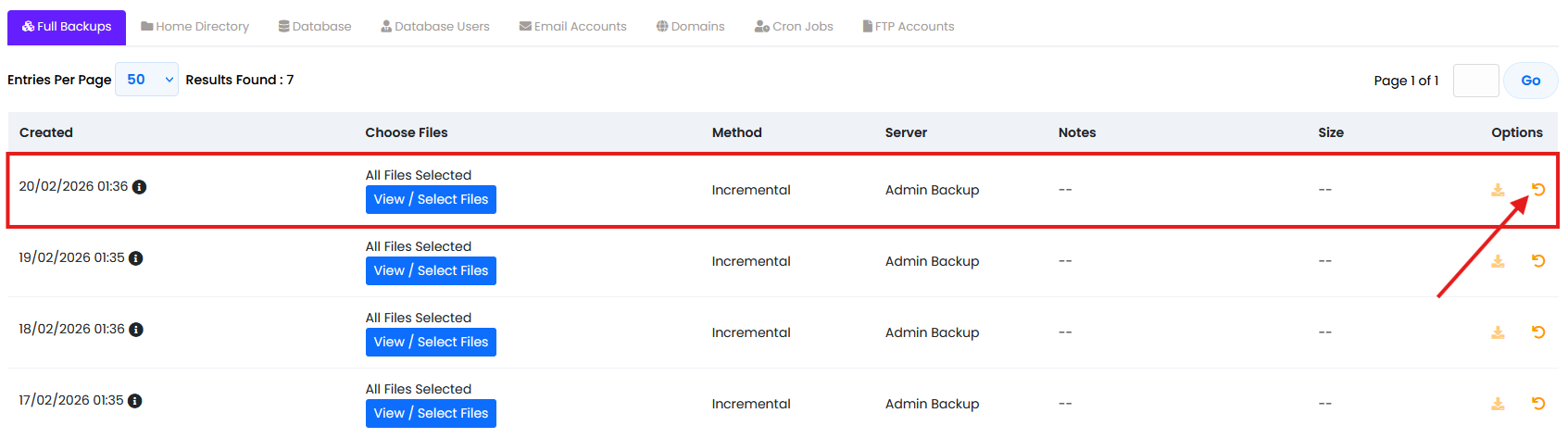 4 - Você verá uma lista com as datas disponíveis. Escolha o backup desejado e clique no botão Restore;