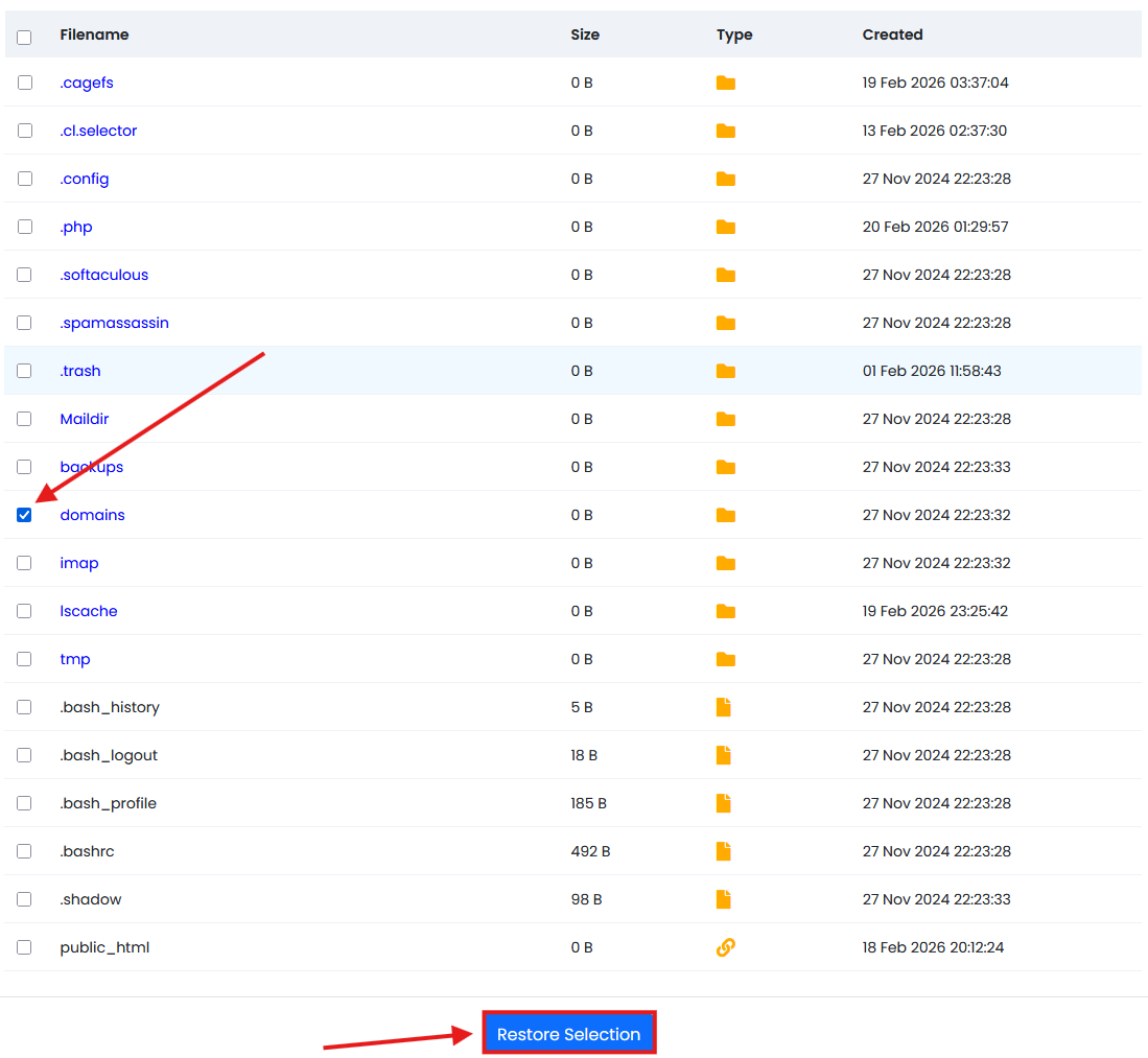 2 - Para Arquivos: Clique em Home Directory, escolha a data e clique em View/Select Files. Navegue pelas pastas (como a public_html), selecione os arquivos desejados e, por fim, clique em Restore Selection;