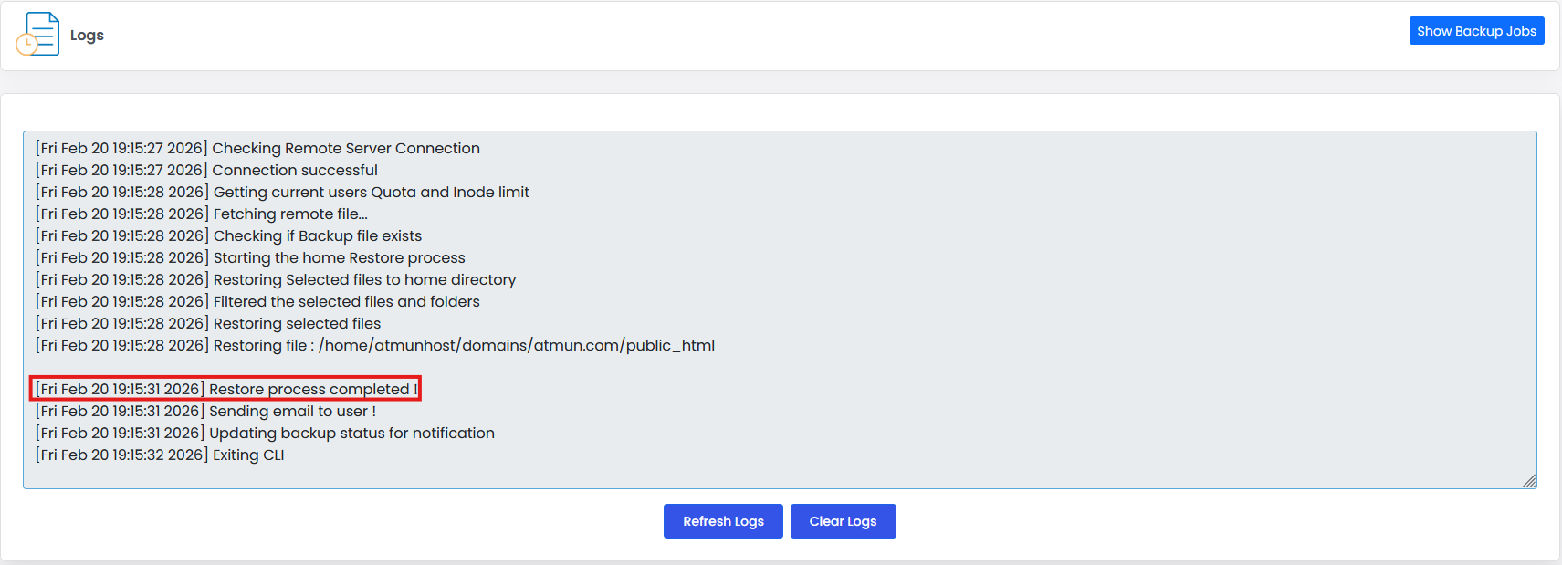 Você pode acompanhar o progresso na opção Logs. Quando aparecer a escrita "Restore process completed", sua conta terá sido restaurada com sucesso.